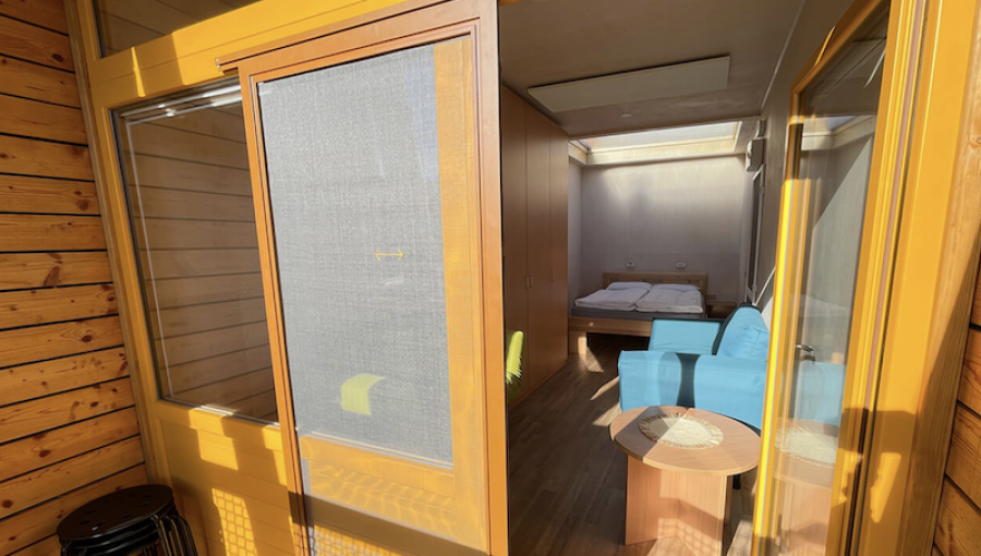 Bungalovy/chatky (3–4 lůžka) s vlastní terasou, venkovní kuchyní a romantickým průhledným stropem pro pozorování hvězd.