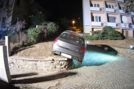 FOTO: Řidička při couvání najela na zídku a tam s autem uvázla, vůz sundali hasi...