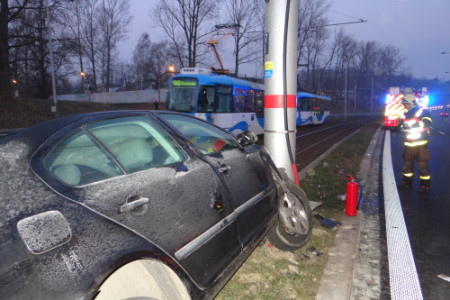 FOTO: Cizinec s octavií narazil do sloupu, vůz zůstal na tramvajových kolejích