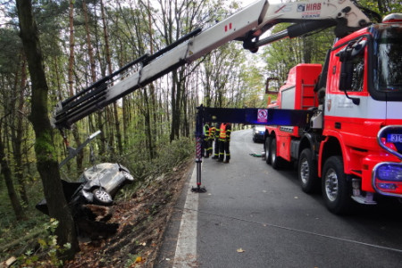 FOTO: Šofér s autem narazil do stromu, hasiči museli odřezat dva vzrostlé duby